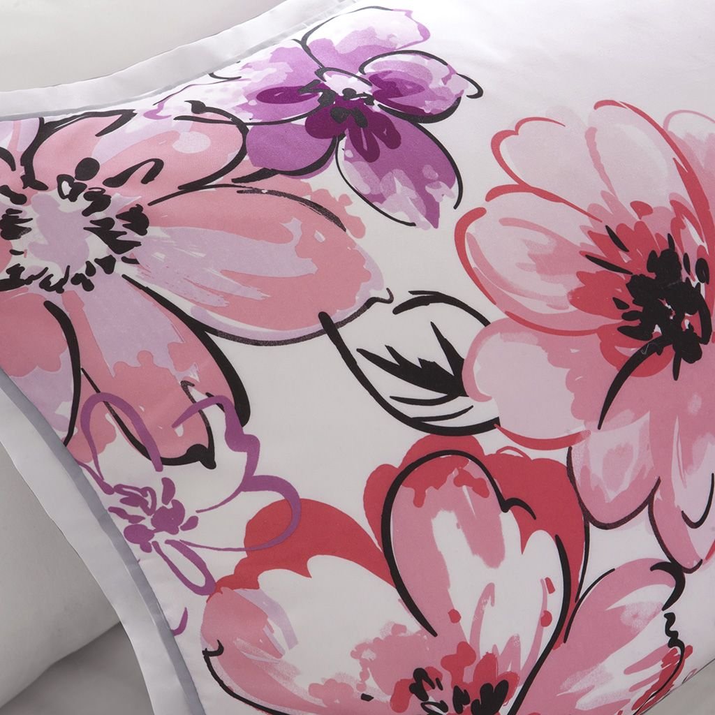 Bring a bright and cheerful update to your bedroom with the Intelligent Design Olivia Comforter Set. The comforter and shams (1 in Twin/TwinXL) flaunts bright colors and an asymmetrical floral print to invigorate your space with striking style. A solid grey reverse complements the top of the bed. The 2 decorative pillows feature floral embroidery and fabric manipulation, adding extra dimension to the top of bed. This bedding set uses an antimicrobial treatment that provides built-in freshness protection, reducing the growth of odor causing bacteria to keep fabric lasting longer.