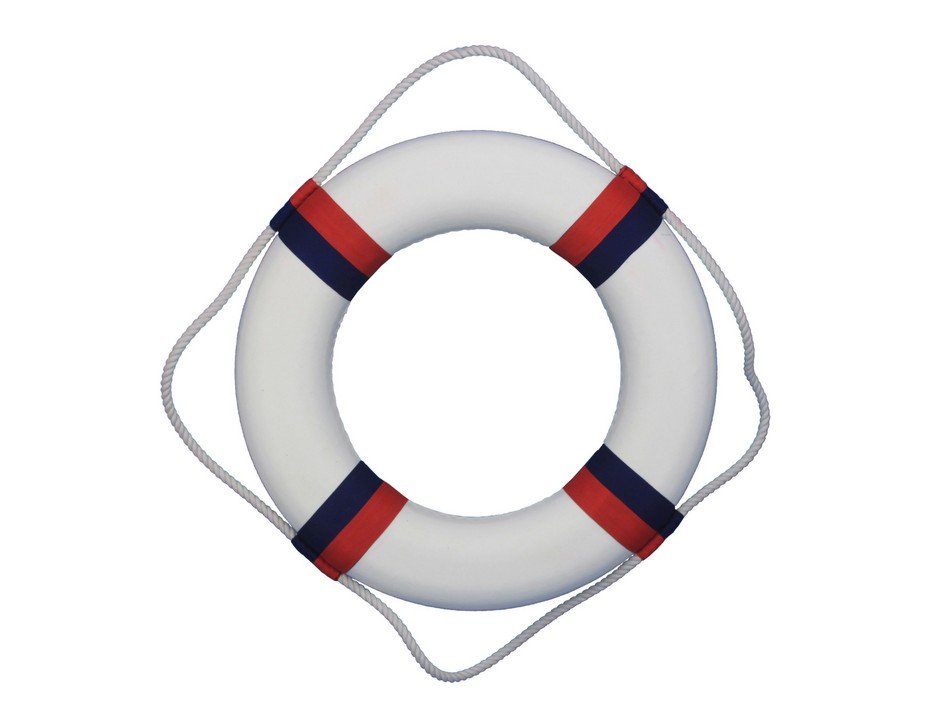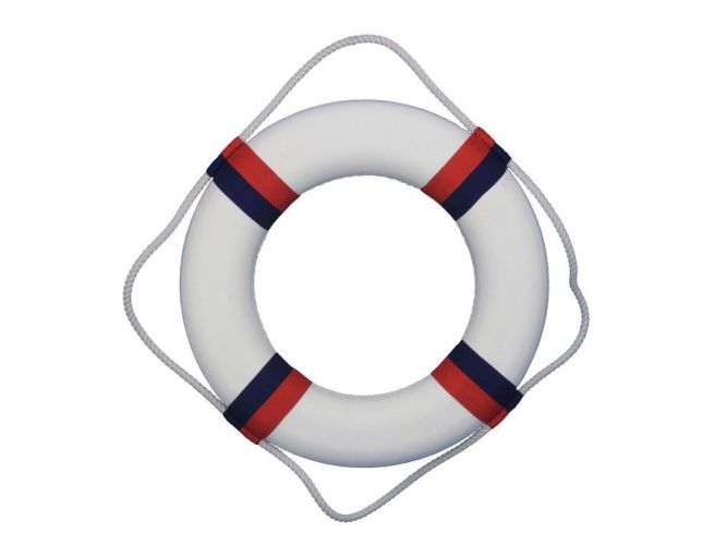 • Prominent white rope and red and blue bands contrast the white finish of the life preserver decoration